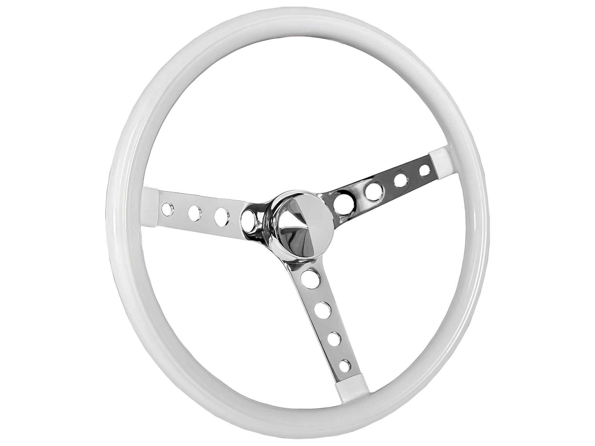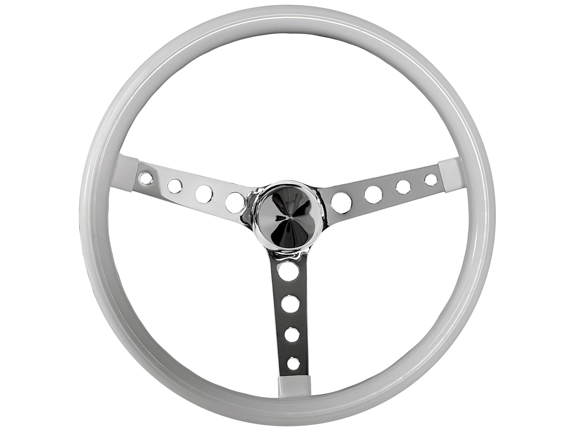 Bring timeless style and enhanced control to your ride with the MOONEYES Original Steering Wheel, featuring the iconic FINGER GRIP design. Finished in a classic white, this old-school-inspired wheel delivers both looks and performance. The ergonomic finger grooves make handling smooth and natural, while the all-around shiny chrome detailing adds a bold, eye-catching touch—especially from the front window.