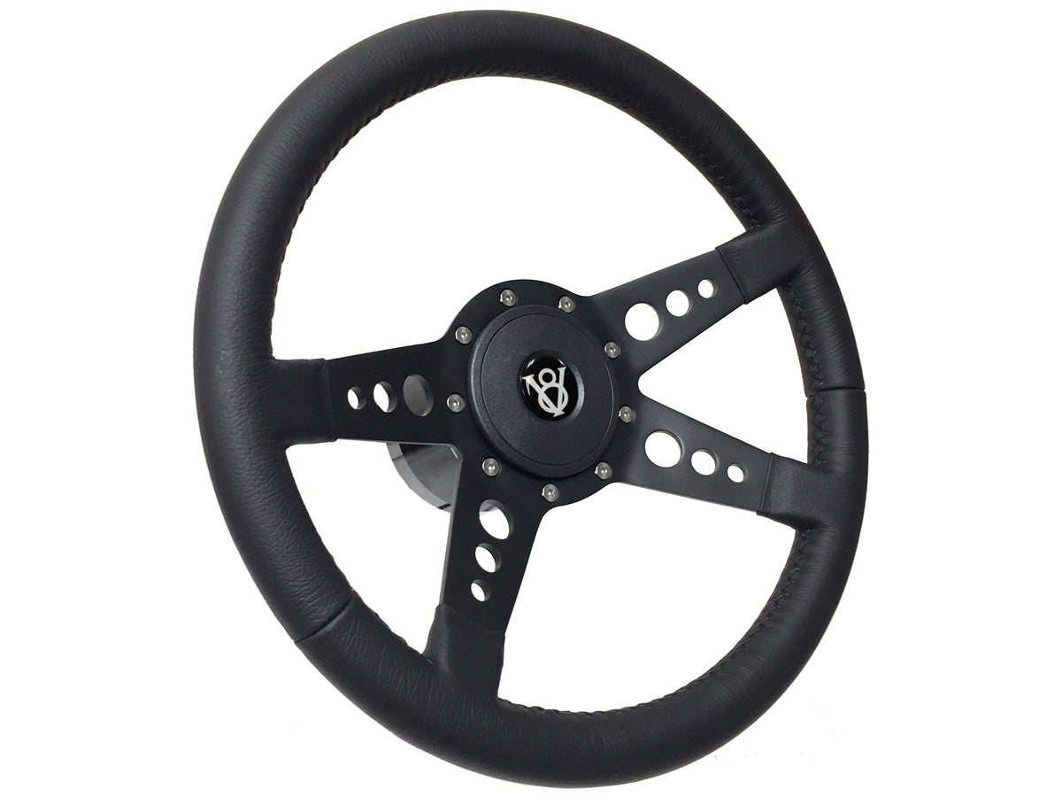 14" Leather 9-Bolt Steering Wheel Hot Rod V8 Black Kit, 4-Spoke Holes