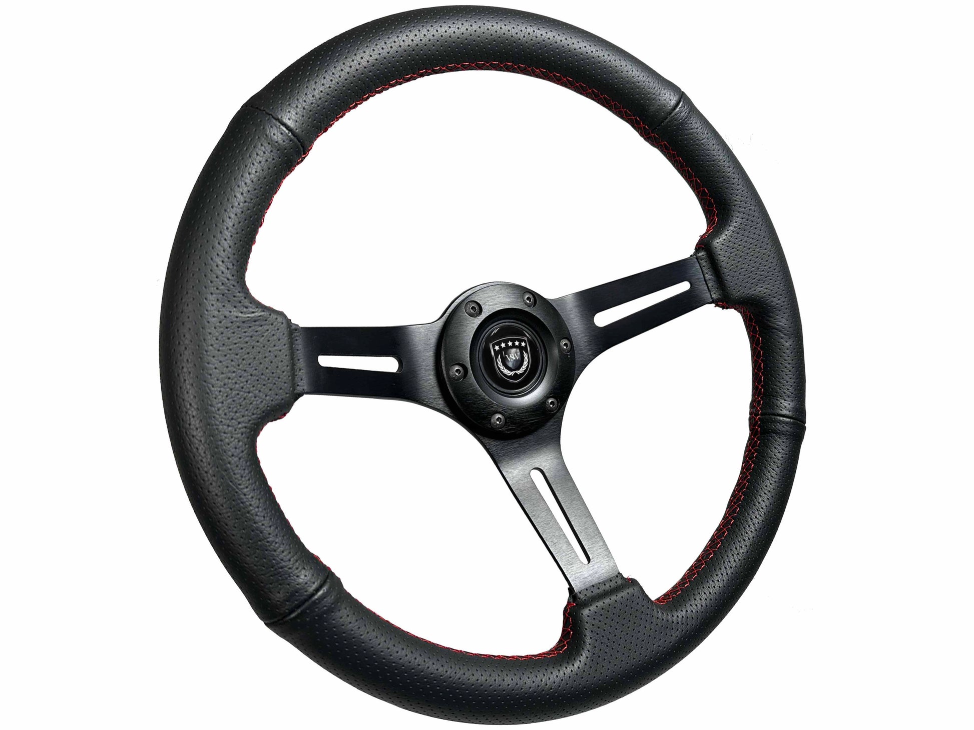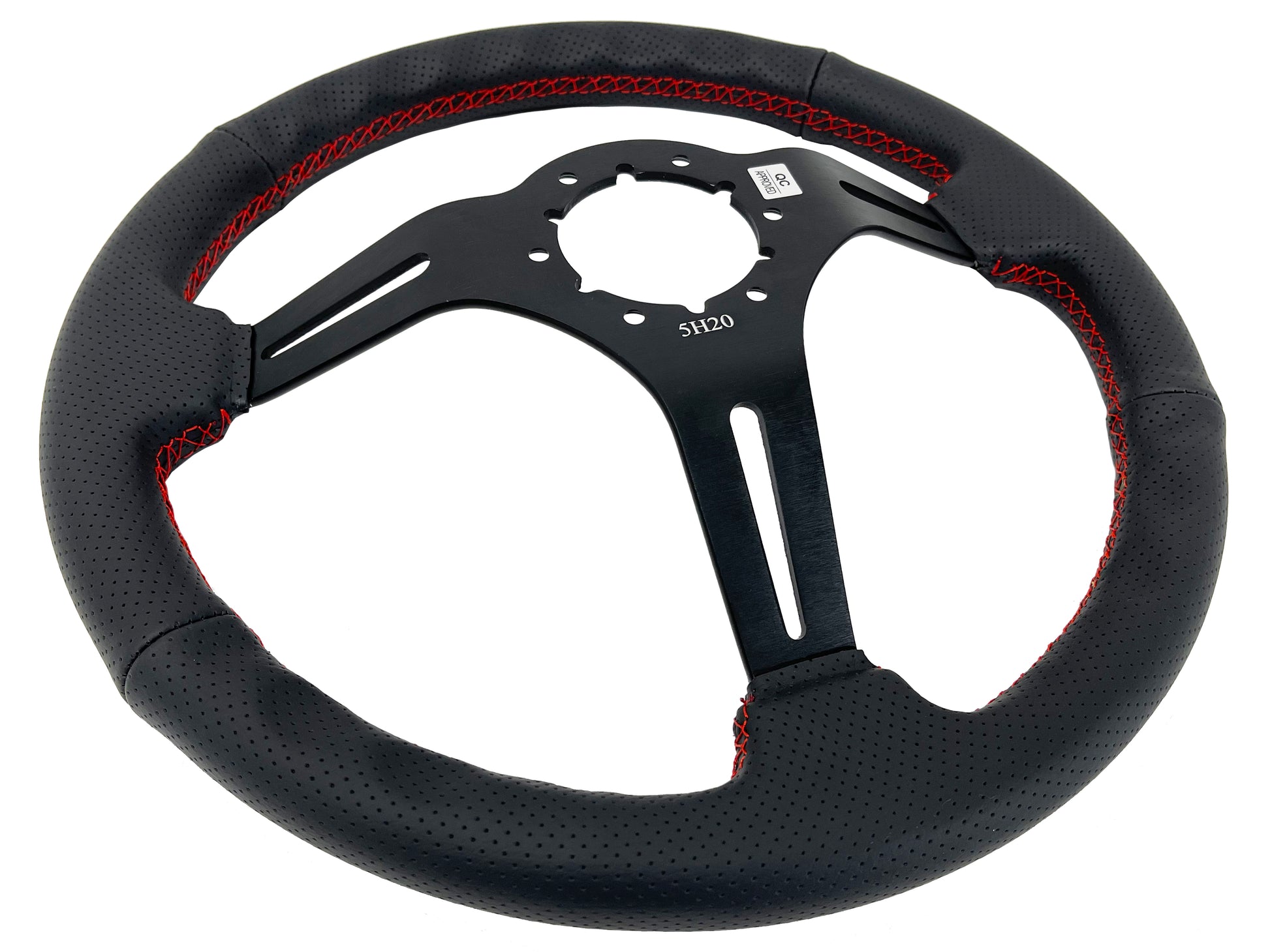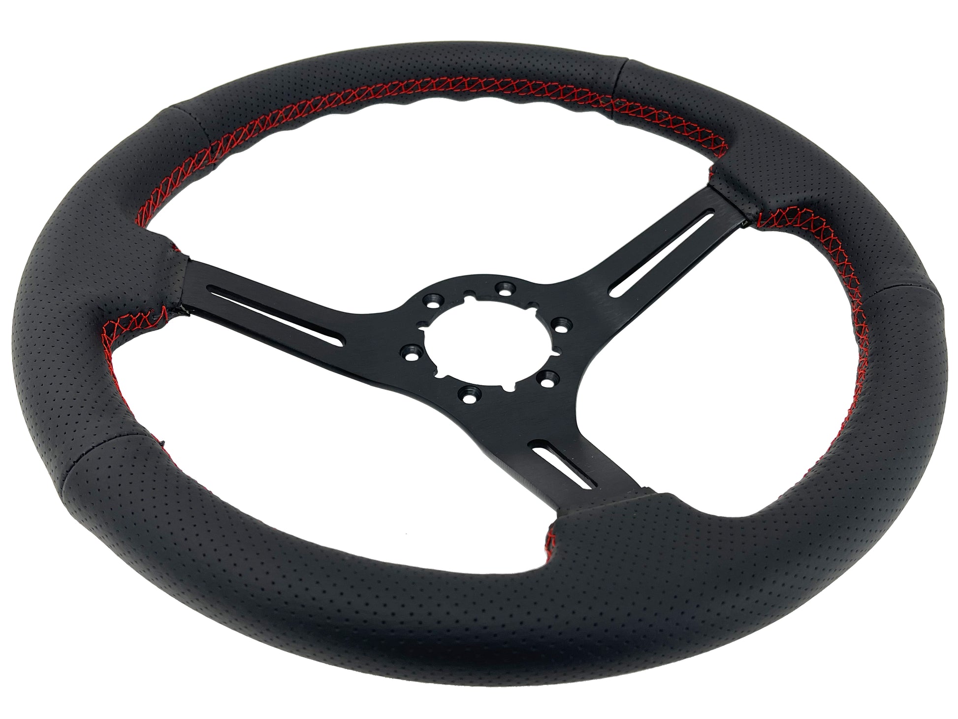 14" Perforated Leather 6-Bolt Steering Wheel, Black Spokes, Red Stitch